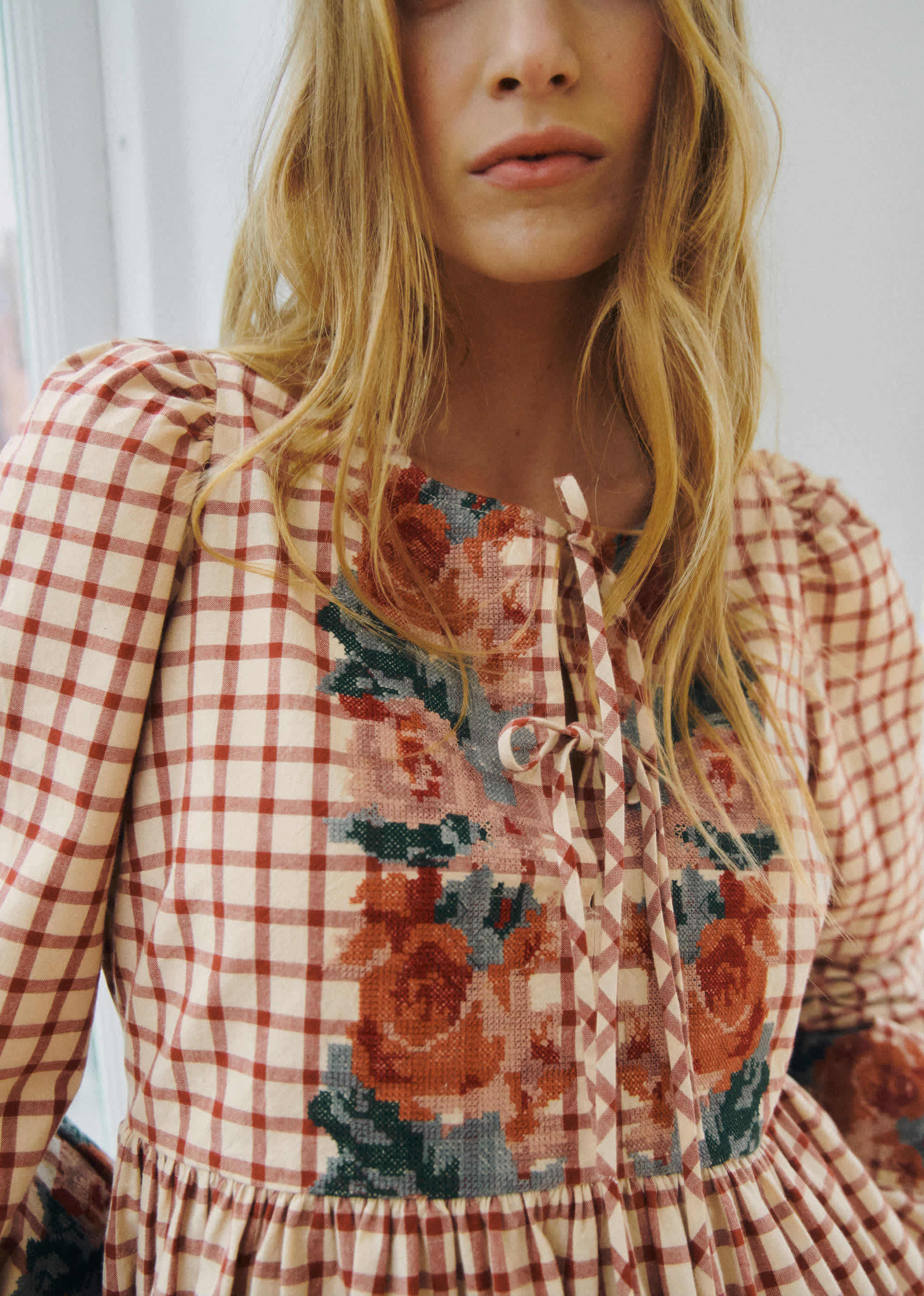 - Broderies au point de croix placées sur le buste, le bas des manches et le bas de robe