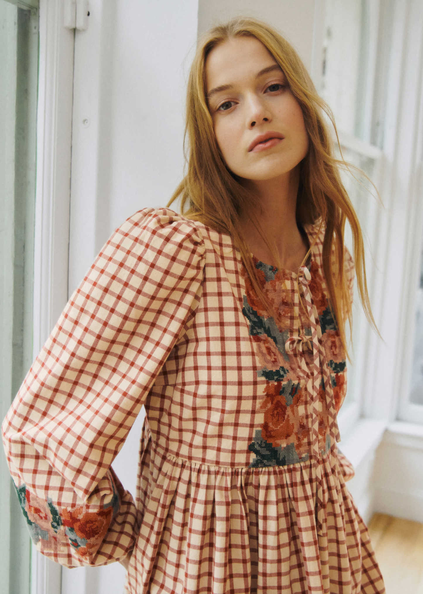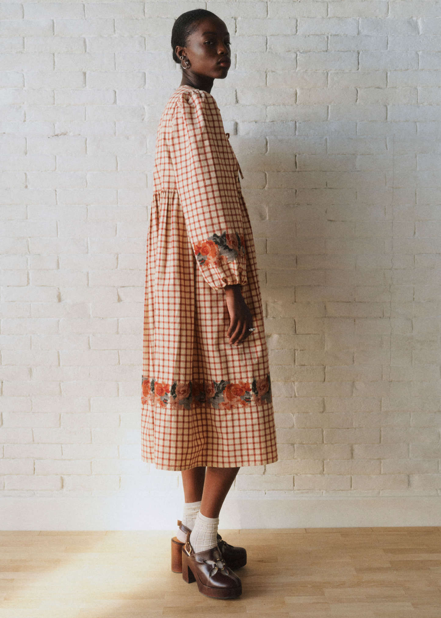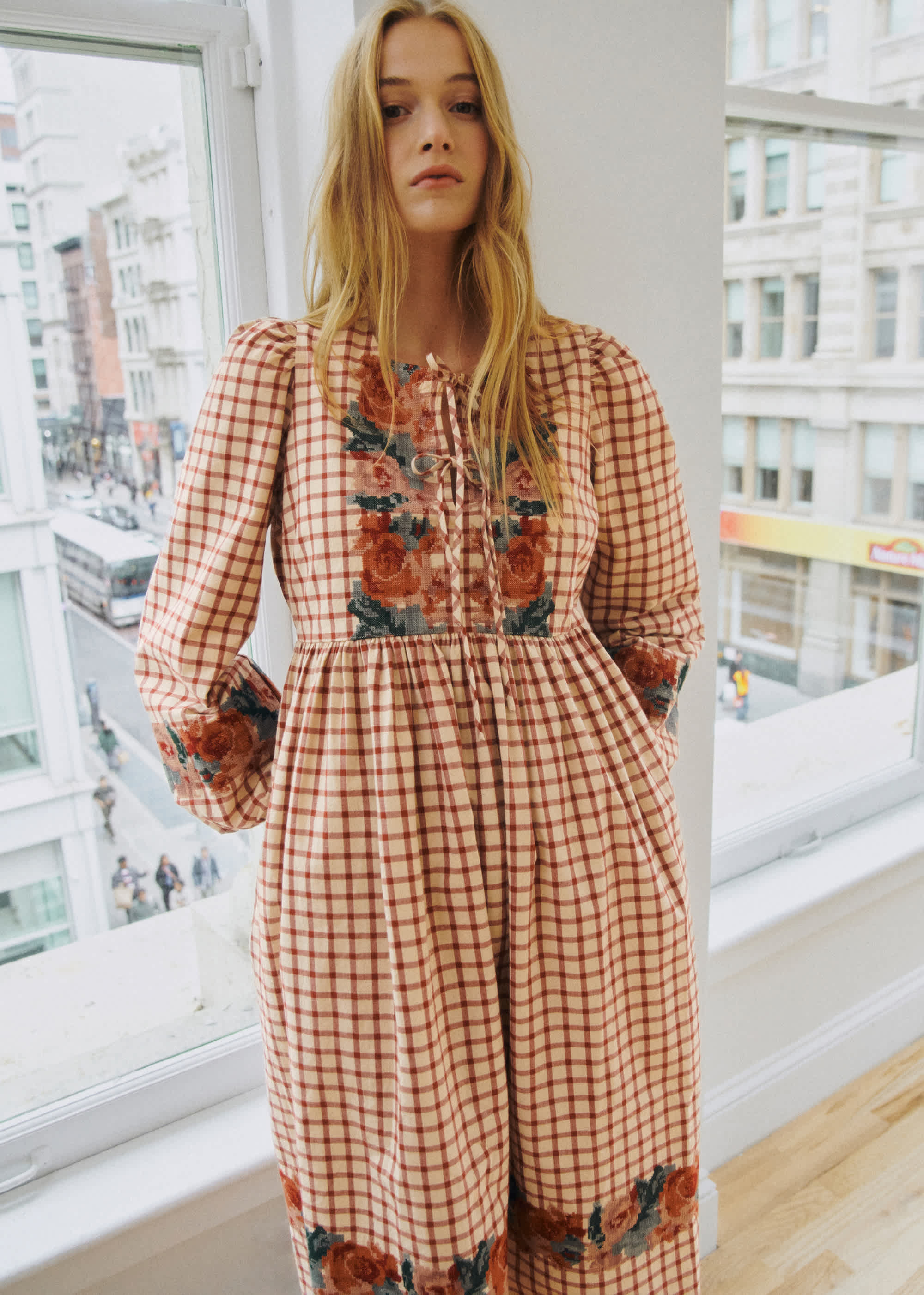 - Robe midi brodée à manches longues